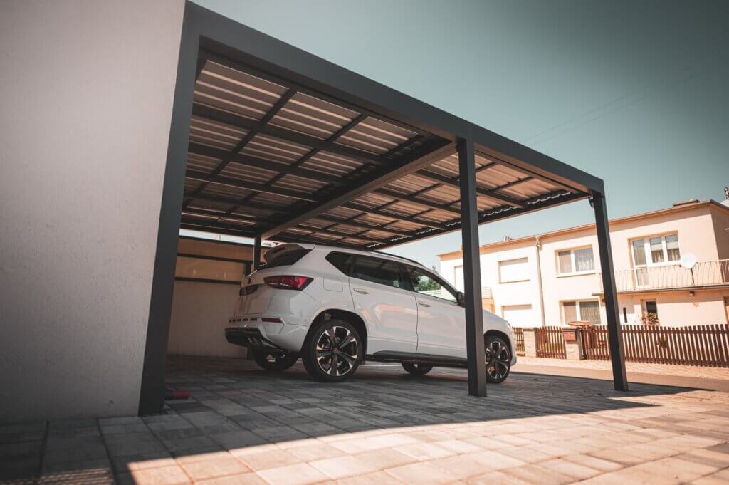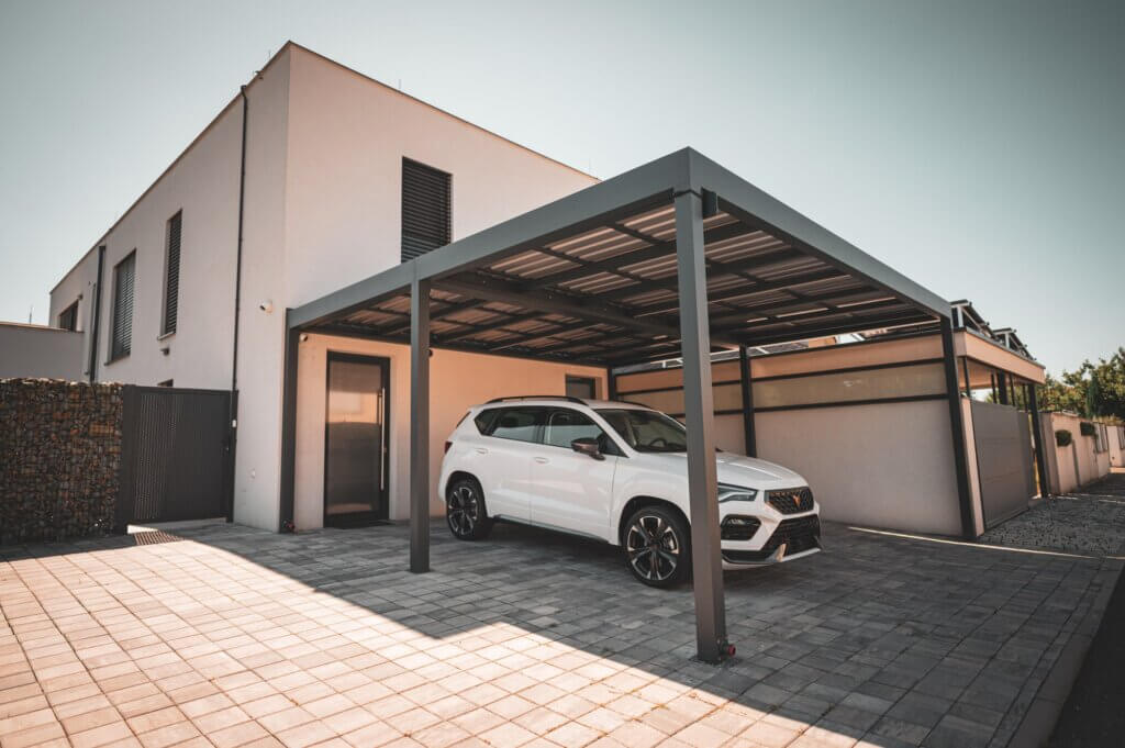 Die Aluminium-Autoüberdachung aus der Werkstatt von Alutech Bohemia passt dank ihrer horizontalen Konstruktion perfekt zu Neubauten mit klaren Linien. Neben dem Schutz des Autos vor schlechtem Wetter schätzen unsere Kunden besonders die Form der Konstruktion, die hervorragend zu den Formen von Pergolen passt, die möglicherweise bereits auf ihren Terrassen stehen.