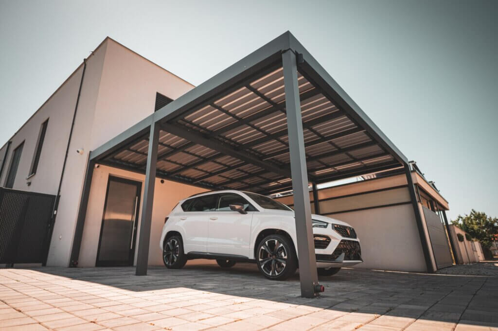 Die Kombination aus einer horizontalen Konstruktion, die mit Trapezblech gedeckt ist, zeichnet sich durch klare Linien aus und bietet Schutz für Ihr Fahrzeug vor Sonne oder schlechtem Wetter.