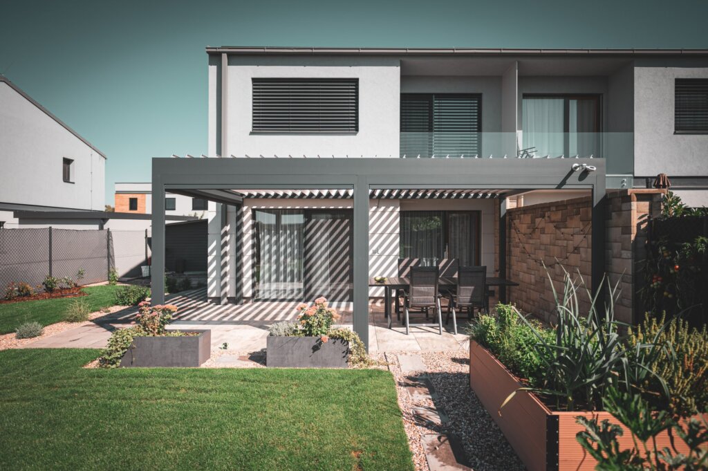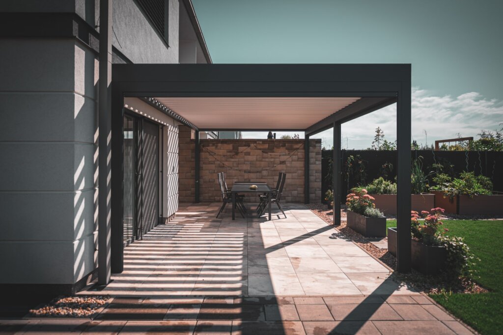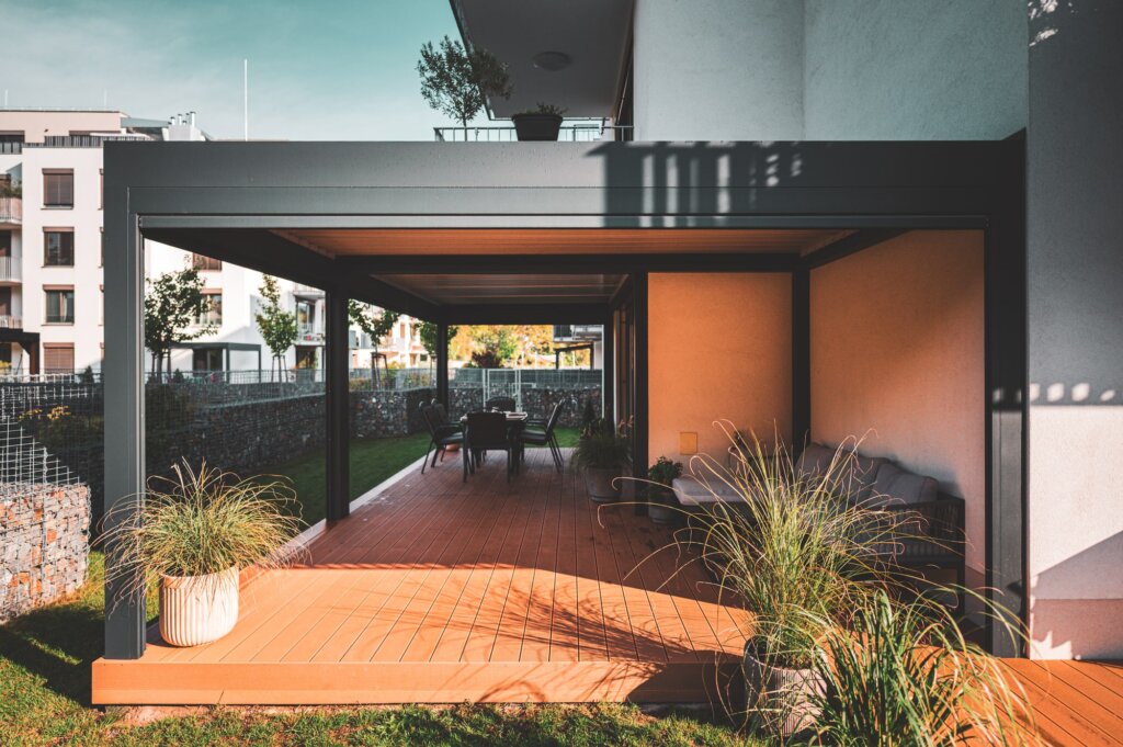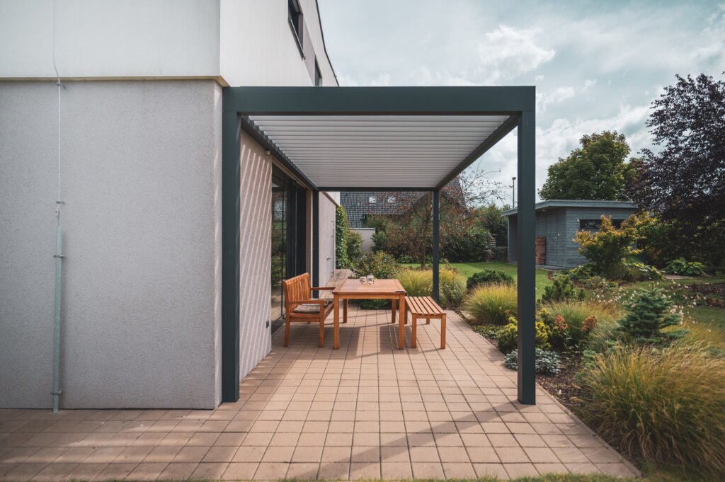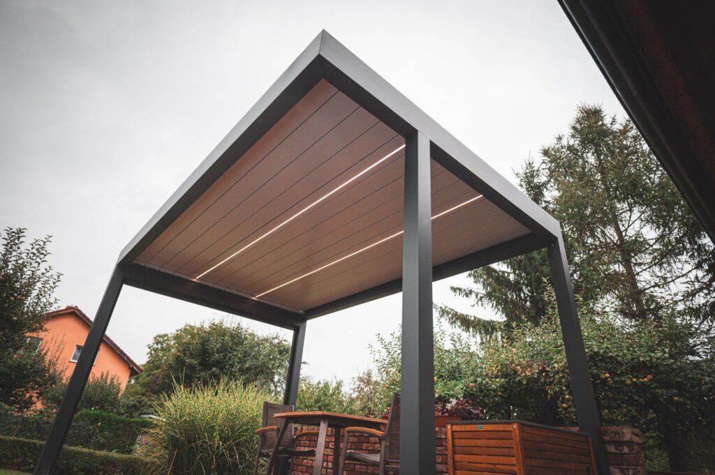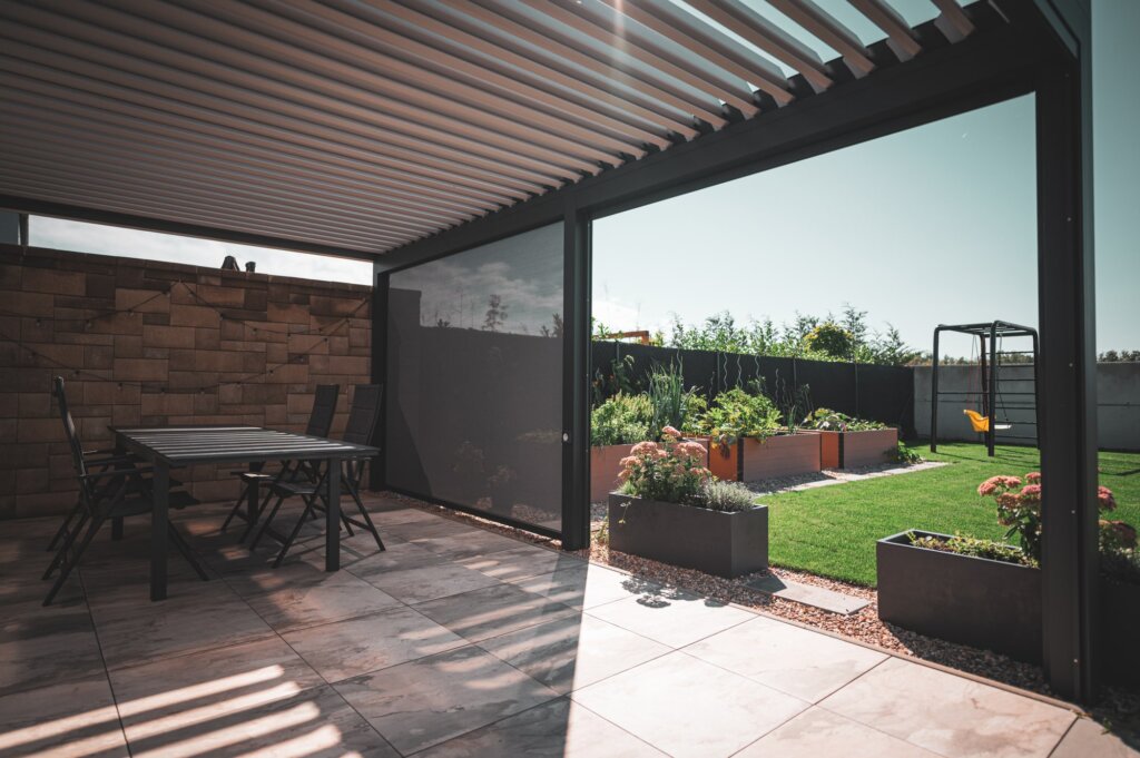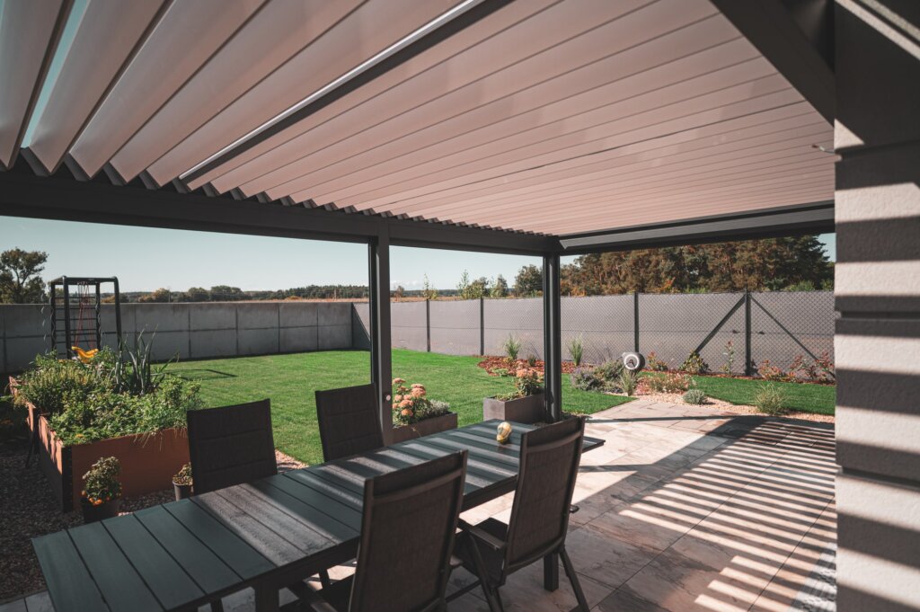 Die Aluminium-Pergola MM BIO verfügt über ein Dach aus verstellbaren Lamellen, was sowohl vollständige Wasserfestigkeit als auch eine außergewöhnliche bioklimatische Funktion ermöglicht, die für angenehme Momente auf Ihrer Terrasse sorgt. Die Pergola Meridiem bietet viele Zusatzoptionen wie Stoffseitenbeschattung, vollständige Verglasung, Infrarotheizung oder Sensoren, die helfen, Ihre Gartenmöbel vor Regen zu schützen. Als heimischer Hersteller sind wir in der Lage, jedes individuelle Kundenwunsch zu erfüllen, sei es in Bezug auf Farbe, Größe oder Befestigungsart.