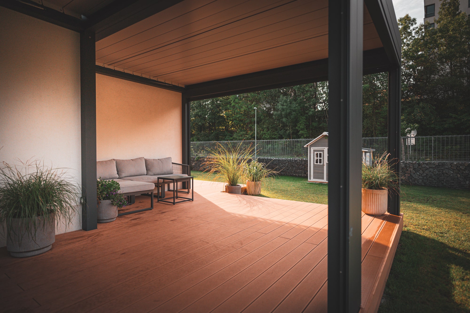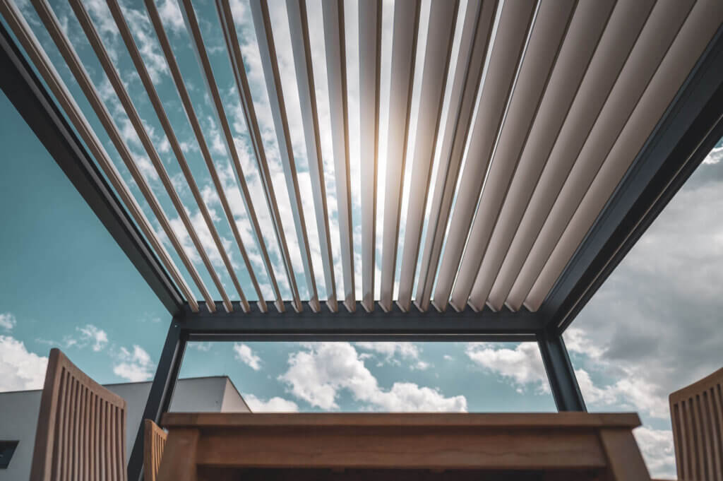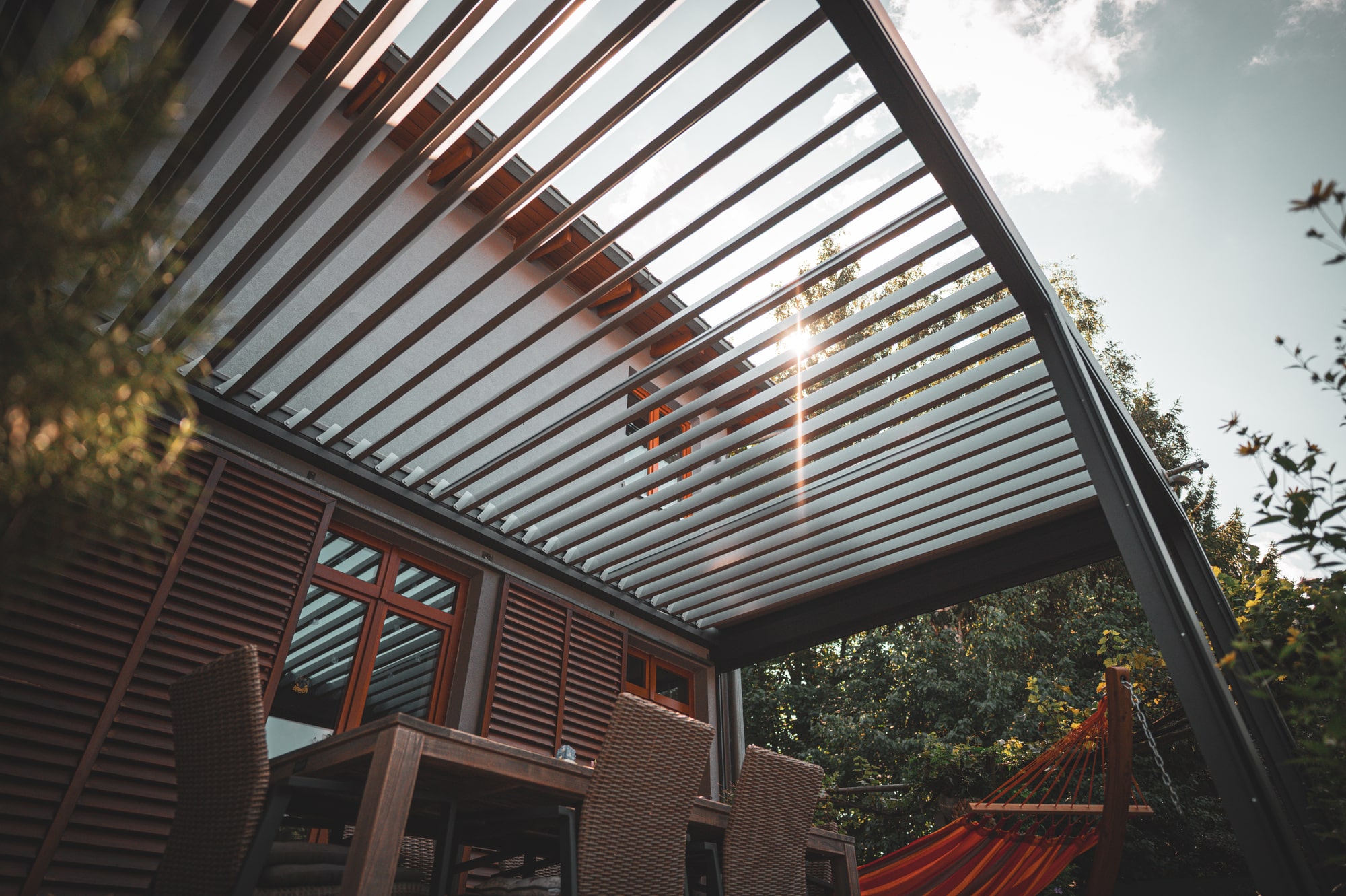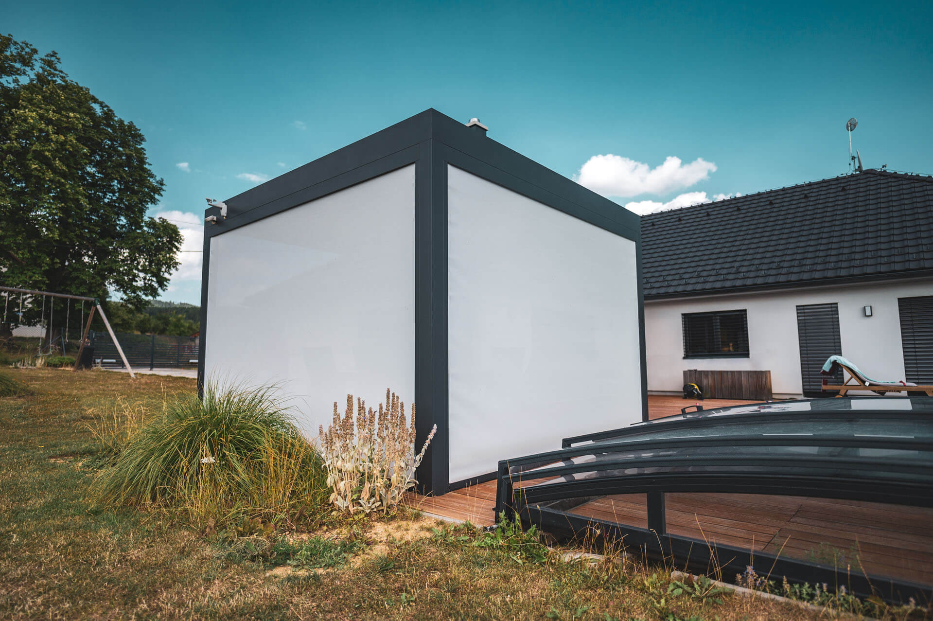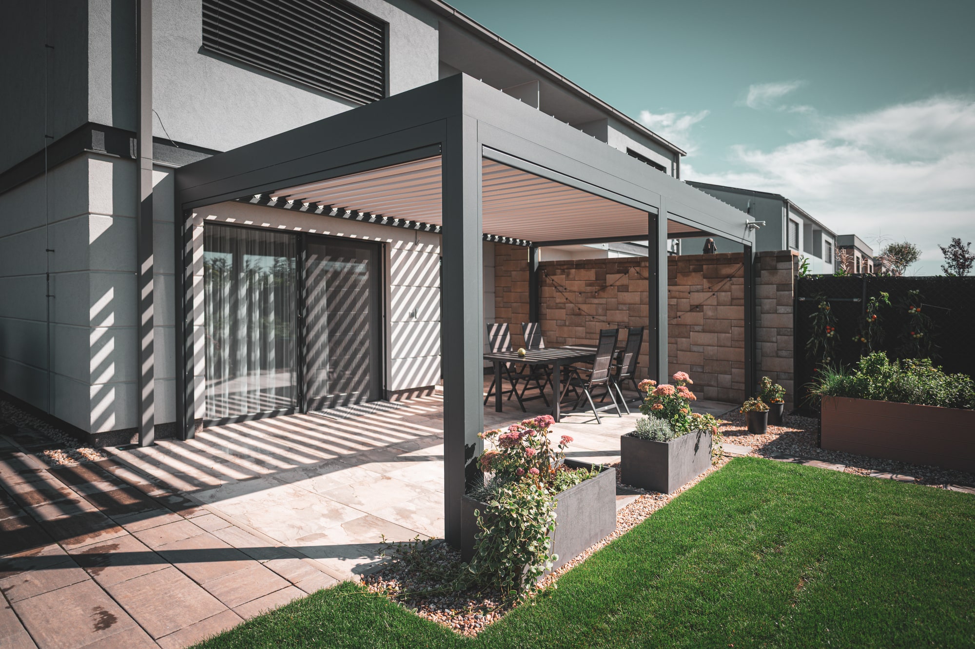 Die Aluminium-Pergola MM BIO verfügt über ein Dach aus verstellbaren Lamellen, was sowohl vollständige Wasserfestigkeit als auch eine außergewöhnliche bioklimatische Funktion ermöglicht, die für angenehme Momente auf Ihrer Terrasse sorgt. Die Pergola Meridiem bietet viele Zusatzoptionen wie Stoffseitenbeschattung, vollständige Verglasung, Infrarotheizung oder Sensoren, die helfen, Ihre Gartenmöbel vor Regen zu schützen. Als heimischer Hersteller sind wir in der Lage, jedes individuelle Kundenwunsch zu erfüllen, sei es in Bezug auf Farbe, Größe oder Befestigungsart.