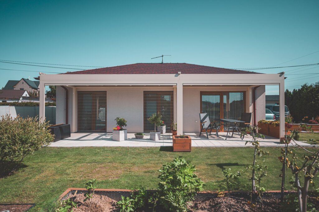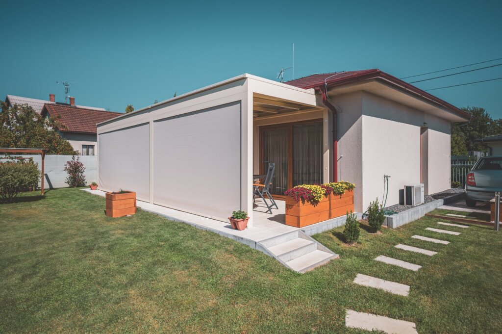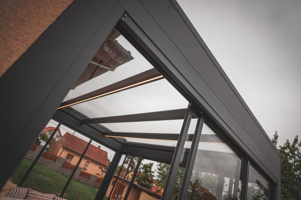 Die Pergola Meridiem Glass ist das erste Produkt seiner Art auf unserem Markt, das sich durch eine völlig gerade Konstruktion und ein verglastes Dach auszeichnet. Die Überdachung ist innerhalb der Konstruktion geneigt, wodurch die Pergola ein einzigartiges modernes Design mit dem Charme kubistischer Formen vereint. Selbstverständlich verfügt die Pergola über ein integriertes Regenrinnensystem, das das Regenwasser in den Tragbalken der Pergola ableitet. Dank ihrer robusten Konstruktion hält die Pergola auch hoher Belastung stand und ermöglicht eine ganzjährige Nutzung. Eine integrierte Dachmarkise und seitliche Schiebeverglasung sind eine äußerst willkommene Ergänzung für die Meridiem Glass Pergola, aber auch LED-Beleuchtung und Infrarotstrahler können eine sinnvolle Ergänzung sein.