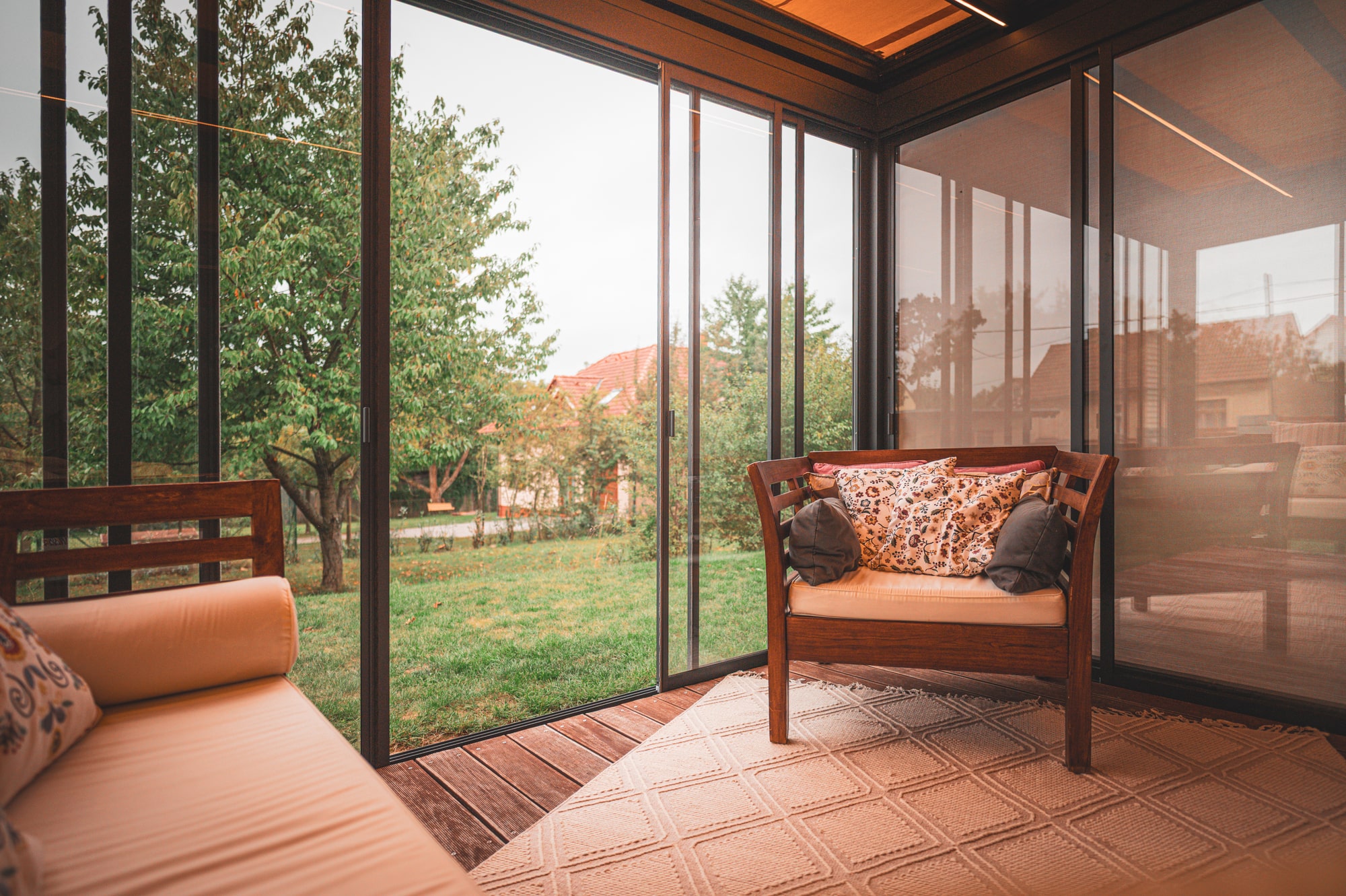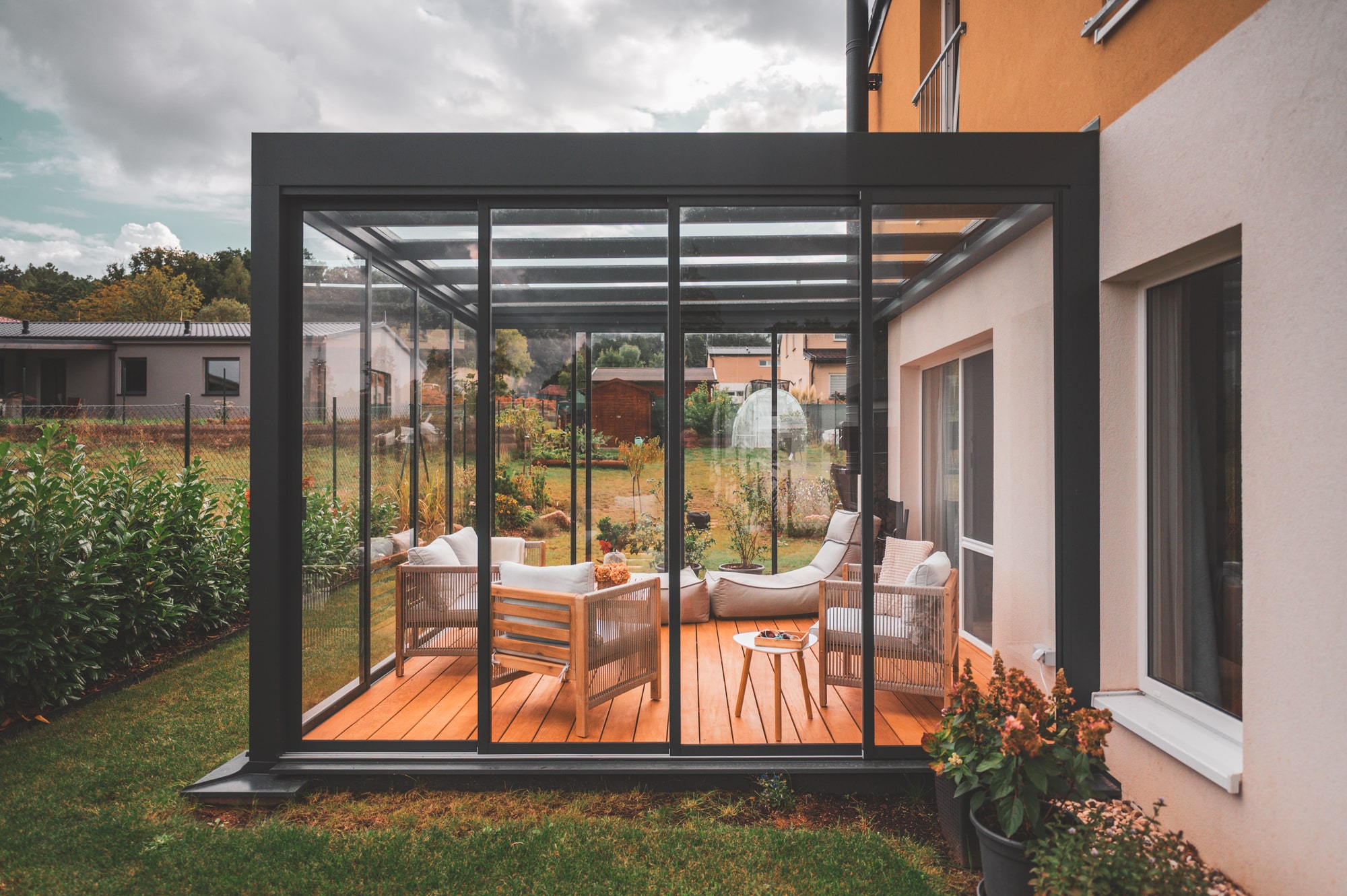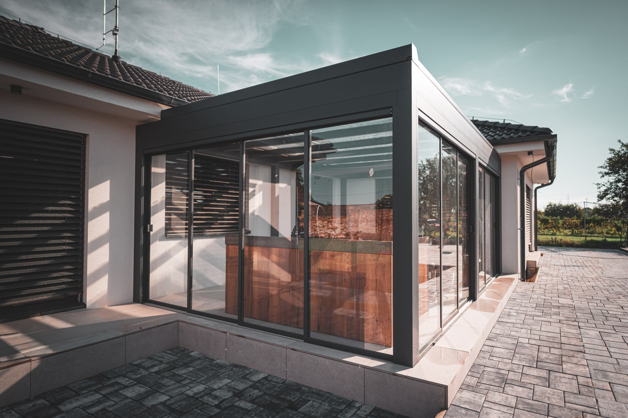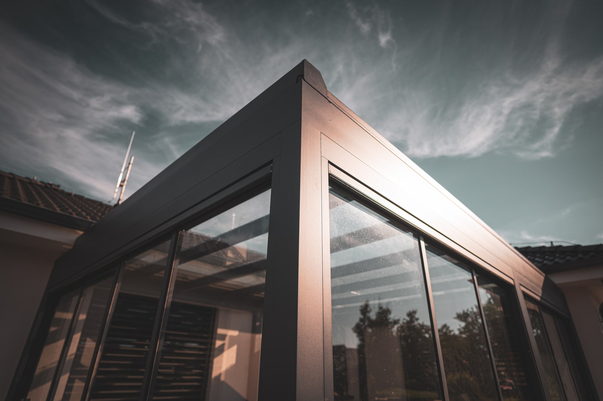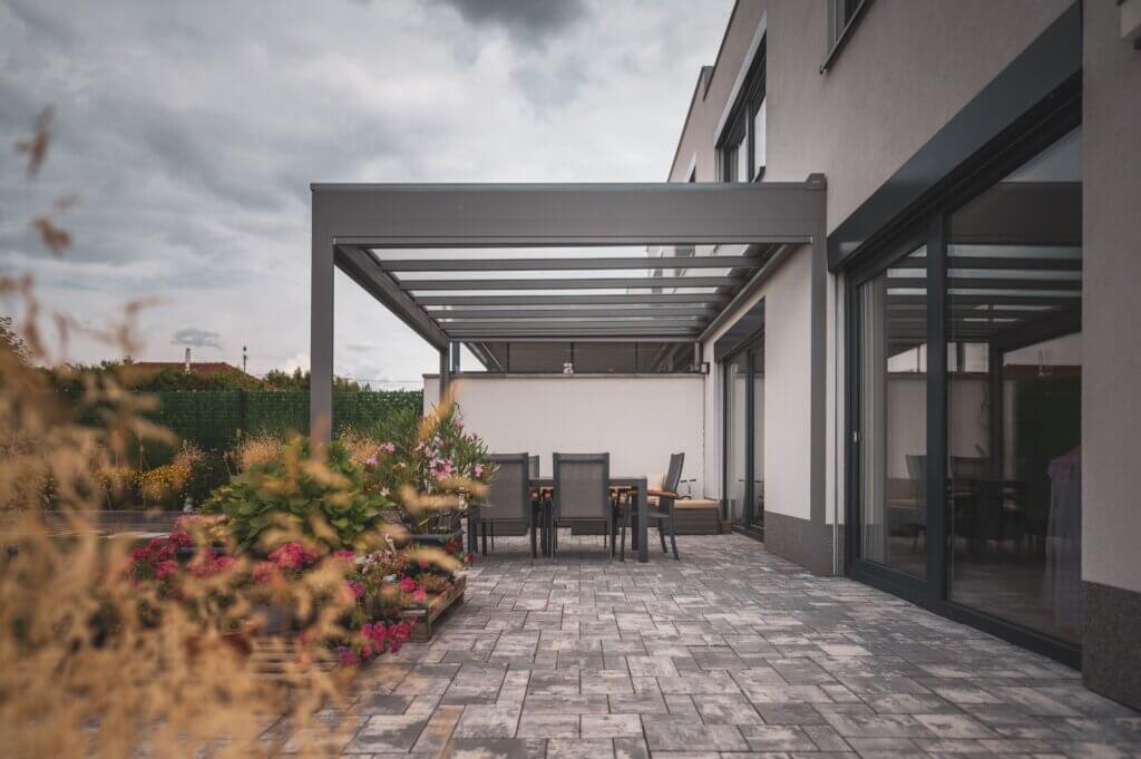 Die Pergola Meridiem Glass ist das erste Produkt seiner Art auf unserem Markt, das sich durch eine völlig gerade Konstruktion und ein verglastes Dach auszeichnet. Die Überdachung ist innerhalb der Konstruktion geneigt, wodurch die Pergola ein einzigartiges modernes Design mit dem Charme kubistischer Formen vereint. Selbstverständlich verfügt die Pergola über ein integriertes Regenrinnensystem, das das Regenwasser in den Tragbalken der Pergola ableitet. Dank ihrer robusten Konstruktion hält die Pergola auch hoher Belastung stand und ermöglicht eine ganzjährige Nutzung. Eine integrierte Dachmarkise und seitliche Schiebeverglasung sind eine äußerst willkommene Ergänzung für die Meridiem Glass Pergola, aber auch LED-Beleuchtung und Infrarotstrahler können eine sinnvolle Ergänzung sein.