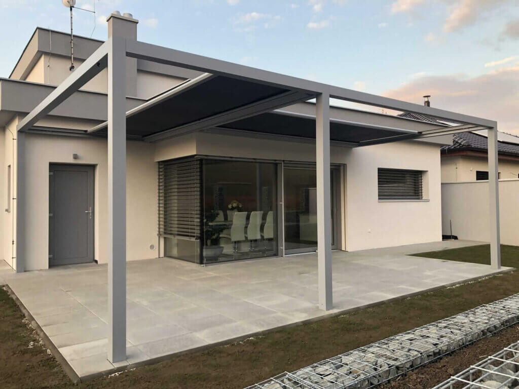 Die Pergola MERIDIEM Soft begeistert durch die Kombination einer Aluminiumkonstruktion mit einer feinen Designlösung für das Dach. Die Aluminiumkonstruktion ist mit einer elektrisch betriebenen Stoffmarkise ausgestattet, die intensiv vor der Sonne schützt und gleichzeitig zur effektiven Senkung der Temperatur unter dem beschatteten Bereich beiträgt.